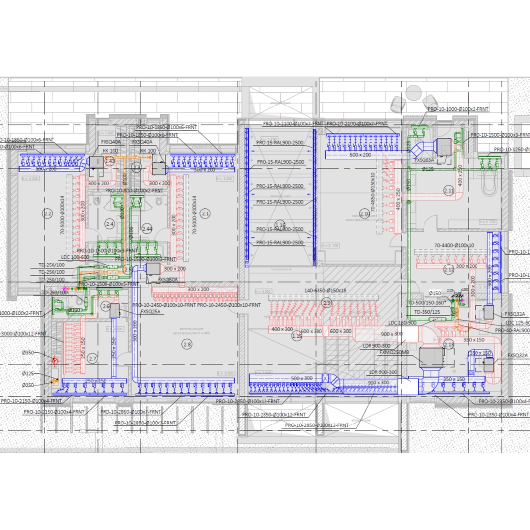 - Полный комплект чертежей: Детальные чертежи, отражающие все аспекты проекта, включая расположение оборудования, трассы воздуховодов и коммуникаций.